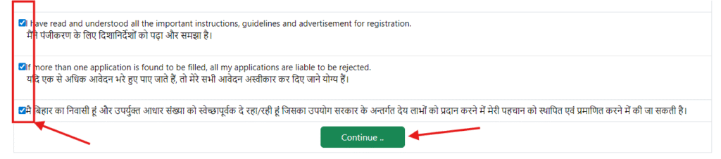 - डिक्लेरेशन बॉक्स को टिक लगाई Continue बटन पर क्लिक करें